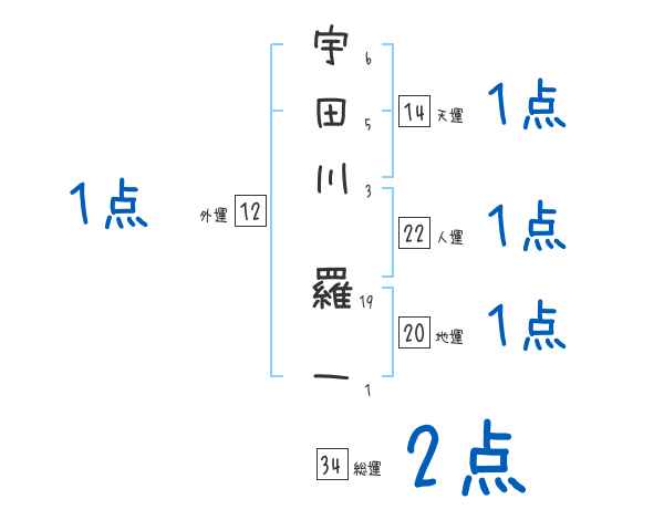 天運![]() | 宇田川羅一さんの天運は14画の1つ星!人に対して優しいがストレスを溜め込みがち。人間関係のトラブルを避けるよう気をつけましょう。 家系が持つ宿命的な運勢を表します。祖先から受け継いだ苗字ですので自分の力が及びません。家柄を象徴します。 |