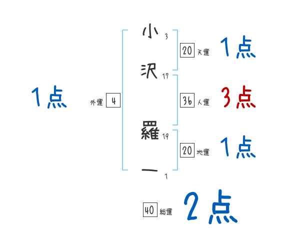 外運![]() | 小沢羅一さんの外運は4画の1つ星!感情が不安定で苦労するかも。周囲との協調を心掛けましょう。 生活面を象徴する運勢です。外部から受ける影響力を表し、結婚運、家庭運や職場、環境への順応性を表します。 |