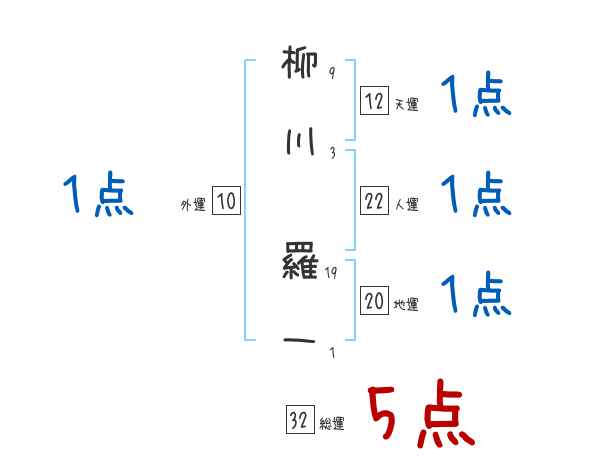 総運![]() | 柳川羅一さんの総運は32画の5つ星!柔軟性があり成功する。チャンスが多く金運が良い。 あなたの人生を表す1番重要な運勢です。生涯を通じて影響する総合運となり、主に50歳以降の晩年期に影響を及ぼします。 |