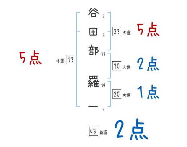 天運![]() | 谷田部羅一さんの天運は23画の5つ星!想像力に優れ活力がある。一代で成功し名誉を手に入れる。 家系が持つ宿命的な運勢を表します。祖先から受け継いだ苗字ですので自分の力が及びません。家柄を象徴します。 |