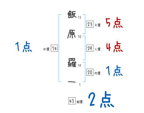 天運![]() | 飯原羅一さんの天運は23画の5つ星!想像力に優れ活力がある。一代で成功し名誉を手に入れる。 家系が持つ宿命的な運勢を表します。祖先から受け継いだ苗字ですので自分の力が及びません。家柄を象徴します。 |