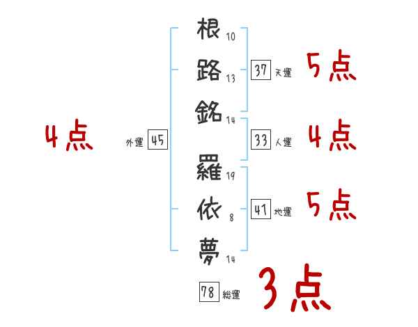 総運![]() | 根路銘羅依夢さんの総運は78画の3つ星!誠実な性格。信念が多少弱い。 あなたの人生を表す1番重要な運勢です。生涯を通じて影響する総合運となり、主に50歳以降の晩年期に影響を及ぼします。 |