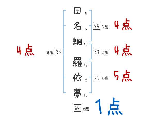 天運![]() | 田名網羅依夢さんの天運は25画の4つ星!個性があり才能があふれる。強運の持ち主で発展する。 家系が持つ宿命的な運勢を表します。祖先から受け継いだ苗字ですので自分の力が及びません。家柄を象徴します。 |