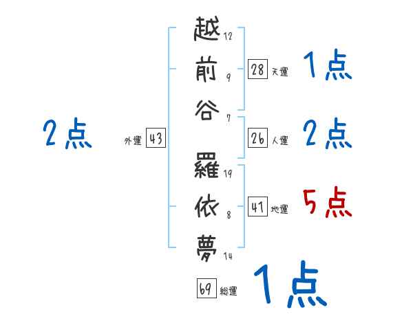 天運![]() | 越前谷羅依夢さんの天運は28画の1つ星!家庭環境に注意。スポーツで活躍できる能力があるかも。 家系が持つ宿命的な運勢を表します。祖先から受け継いだ苗字ですので自分の力が及びません。家柄を象徴します。 |