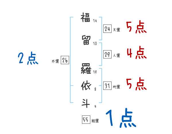 天運![]() | 福留羅依斗さんの天運は24画の5つ星!家庭運が良く順調な人生。金運にも恵まれる。 家系が持つ宿命的な運勢を表します。祖先から受け継いだ苗字ですので自分の力が及びません。家柄を象徴します。 |