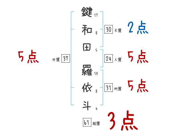 外運![]() | 鍵和田羅依斗さんの外運は37画の5つ星!努力家で順応性に優れる。現実的な考え方ができ忠実に物事をこなす。 生活面を象徴する運勢です。外部から受ける影響力を表し、結婚運、家庭運や職場、環境への順応性を表します。 |