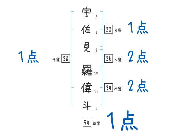 外運![]() | 宇佐見羅偉斗さんの外運は28画の1つ星!家庭環境に注意。スポーツで活躍できる能力があるかも。 生活面を象徴する運勢です。外部から受ける影響力を表し、結婚運、家庭運や職場、環境への順応性を表します。 |