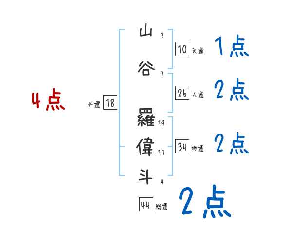 総運![]() | 山谷羅偉斗さんの総運は44画の2つ星!誠実で慎重な性格。物事を考えすぎないように注意しましょう。 あなたの人生を表す1番重要な運勢です。生涯を通じて影響する総合運となり、主に50歳以降の晩年期に影響を及ぼします。 |