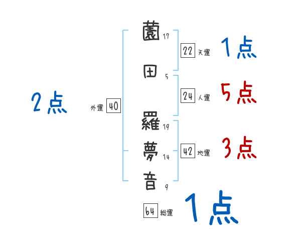 天運![]() | 薗田羅夢音さんの天運は22画の1つ星!努力することが苦手ないっぽう手先が器用。芸術性にも優れる。 家系が持つ宿命的な運勢を表します。祖先から受け継いだ苗字ですので自分の力が及びません。家柄を象徴します。 |