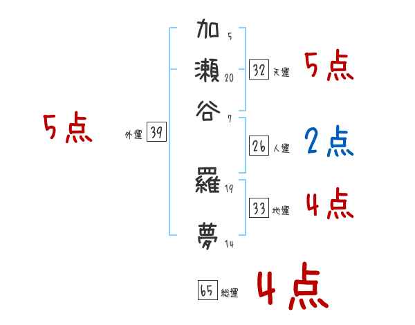 外運![]() | 加瀬谷羅夢さんの外運は39画の5つ星!社交性に優れ人望が厚い。人の上に立ち成功する。 生活面を象徴する運勢です。外部から受ける影響力を表し、結婚運、家庭運や職場、環境への順応性を表します。 |