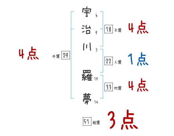 総運![]() | 宇治川羅夢さんの総運は51画の3つ星!変化が激しく、危険に注意。堅実な性格。 あなたの人生を表す1番重要な運勢です。生涯を通じて影響する総合運となり、主に50歳以降の晩年期に影響を及ぼします。 |