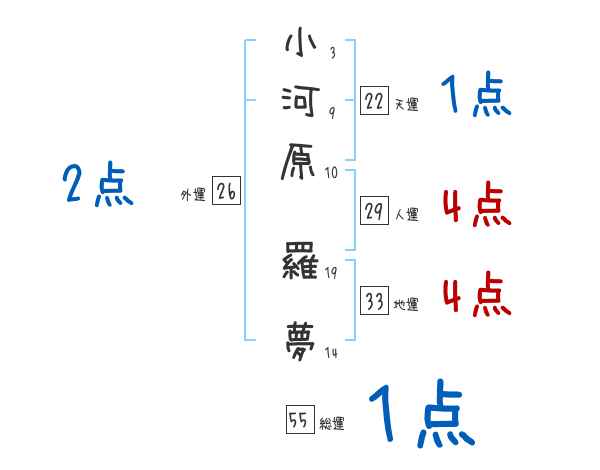 | 天運  | 小河原羅夢さんの天運は22画の1つ星!努力することが苦手ないっぽう手先が器用。芸術性にも優れる。家系が持つ宿命的な運勢を表します。祖先から受け継いだ苗字ですので自分の力が及びません。家柄を象徴します。 |