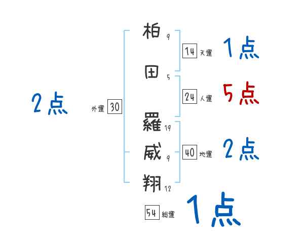外運![]() | 柏田羅威翔さんの外運は30画の2つ星!浮き沈みの激しさに注意しましょう。 生活面を象徴する運勢です。外部から受ける影響力を表し、結婚運、家庭運や職場、環境への順応性を表します。 |