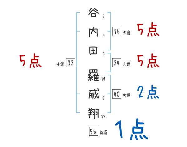 外運![]() | 谷内田羅威翔さんの外運は32画の5つ星!柔軟性があり成功する。チャンスが多く金運が良い。 生活面を象徴する運勢です。外部から受ける影響力を表し、結婚運、家庭運や職場、環境への順応性を表します。 |