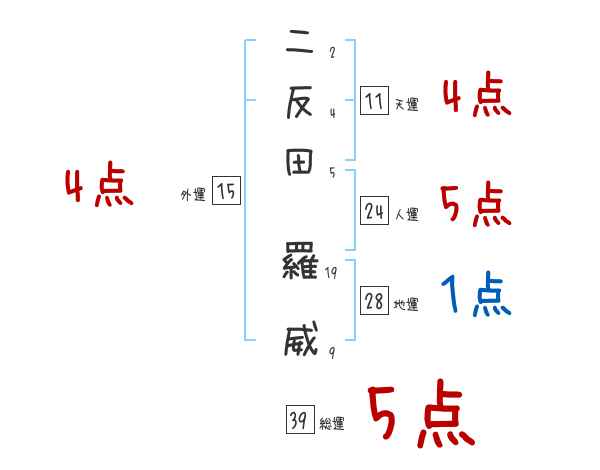 天運![]() | 二反田羅威さんの天運は11画の4つ星!着実に富や地位を得る幸運な人生。 家系が持つ宿命的な運勢を表します。祖先から受け継いだ苗字ですので自分の力が及びません。家柄を象徴します。 |