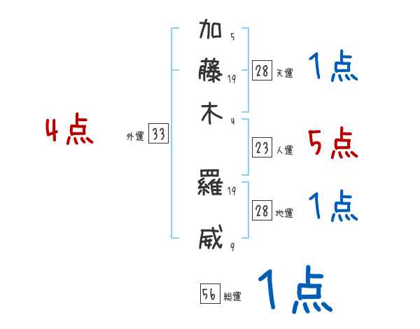 天運![]() | 加藤木羅威さんの天運は28画の1つ星!家庭環境に注意。スポーツで活躍できる能力があるかも。 家系が持つ宿命的な運勢を表します。祖先から受け継いだ苗字ですので自分の力が及びません。家柄を象徴します。 |