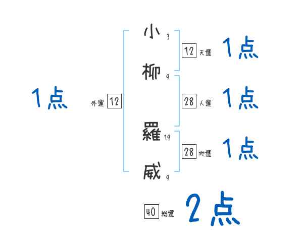 天運![]() | 小柳羅威さんの天運は12画の1つ星!簡単な失敗で諦めてしまいやすいかも。着実に行動すると良いでしょう。 家系が持つ宿命的な運勢を表します。祖先から受け継いだ苗字ですので自分の力が及びません。家柄を象徴します。 |