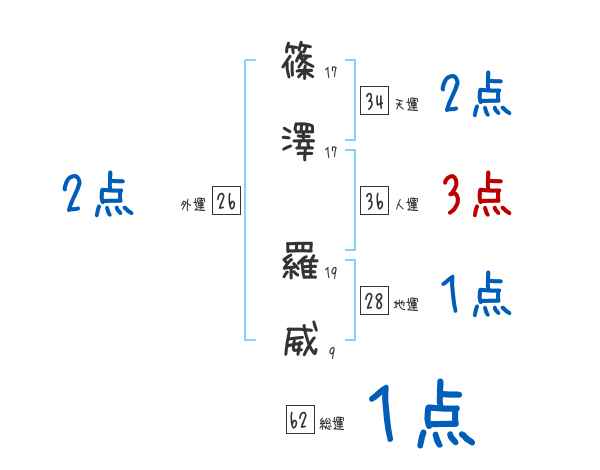 天運![]() | 篠澤羅威さんの天運は34画の2つ星!独創性に優れるが、自尊心が強く災難に注意しましょう。 家系が持つ宿命的な運勢を表します。祖先から受け継いだ苗字ですので自分の力が及びません。家柄を象徴します。 |