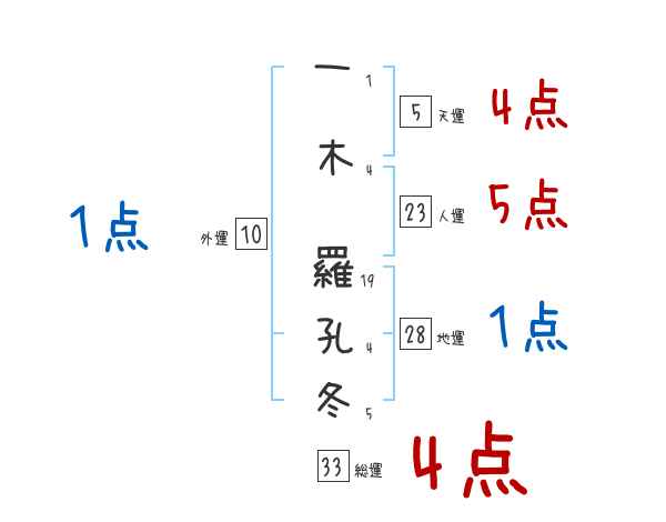 天運![]() | 一木羅孔冬さんの天運は5画の4つ星!健康で安泰。協調性に優れ、財産に恵まれる。 家系が持つ宿命的な運勢を表します。祖先から受け継いだ苗字ですので自分の力が及びません。家柄を象徴します。 |