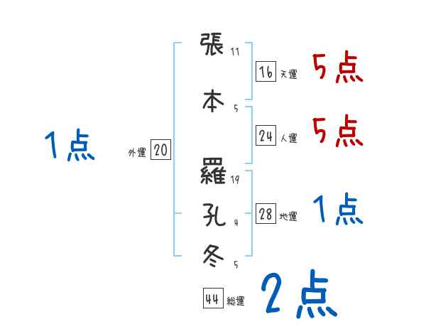 天運![]() | 張本羅孔冬さんの天運は16画の5つ星!人望が厚く大きく発展する。逆転成功が見える。 家系が持つ宿命的な運勢を表します。祖先から受け継いだ苗字ですので自分の力が及びません。家柄を象徴します。 |