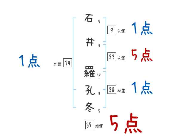 人運![]() | 石井羅孔冬さんの人運は23画の5つ星!想像力に優れ活力がある。一代で成功し名誉を手に入れる。 性格や才能などを表す2番目に重要な運勢です。人間関係や協調性、社会的な成功に影響します。主に20歳から50歳ぐらいまでの中年期の運勢を表します。 |