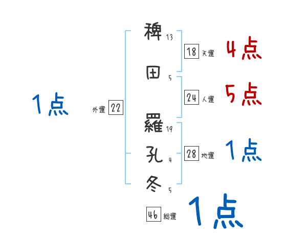 天運![]() | 稗田羅孔冬さんの天運は18画の4つ星!情熱的で剛気。忍耐力があり信頼される。 家系が持つ宿命的な運勢を表します。祖先から受け継いだ苗字ですので自分の力が及びません。家柄を象徴します。 |
