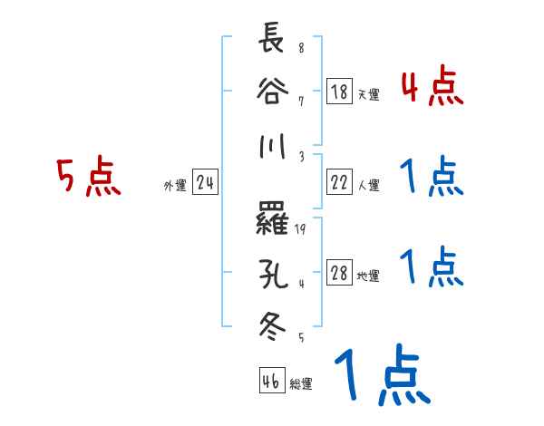 天運![]() | 長谷川羅孔冬さんの天運は18画の4つ星!情熱的で剛気。忍耐力があり信頼される。 家系が持つ宿命的な運勢を表します。祖先から受け継いだ苗字ですので自分の力が及びません。家柄を象徴します。 |