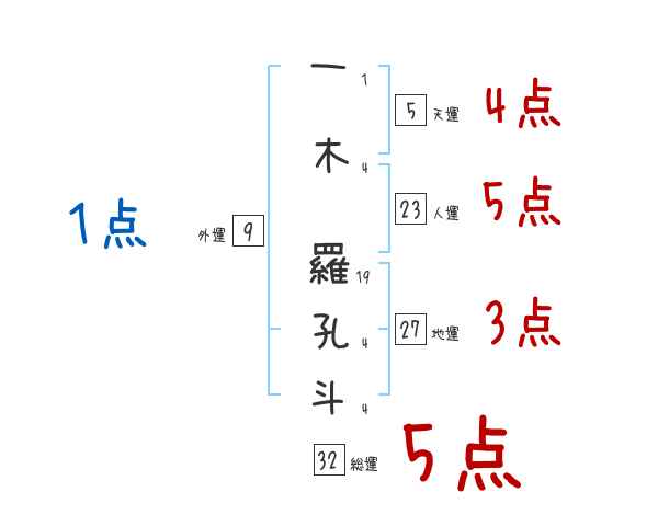 天運![]() | 一木羅孔斗さんの天運は5画の4つ星!健康で安泰。協調性に優れ、財産に恵まれる。 家系が持つ宿命的な運勢を表します。祖先から受け継いだ苗字ですので自分の力が及びません。家柄を象徴します。 |