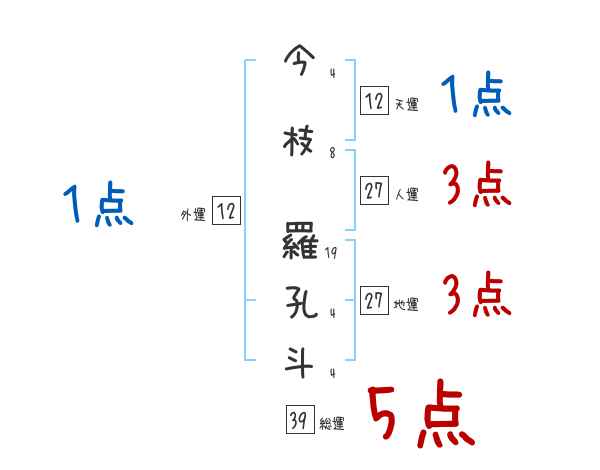 天運![]() | 今枝羅孔斗さんの天運は12画の1つ星!簡単な失敗で諦めてしまいやすいかも。着実に行動すると良いでしょう。 家系が持つ宿命的な運勢を表します。祖先から受け継いだ苗字ですので自分の力が及びません。家柄を象徴します。 |