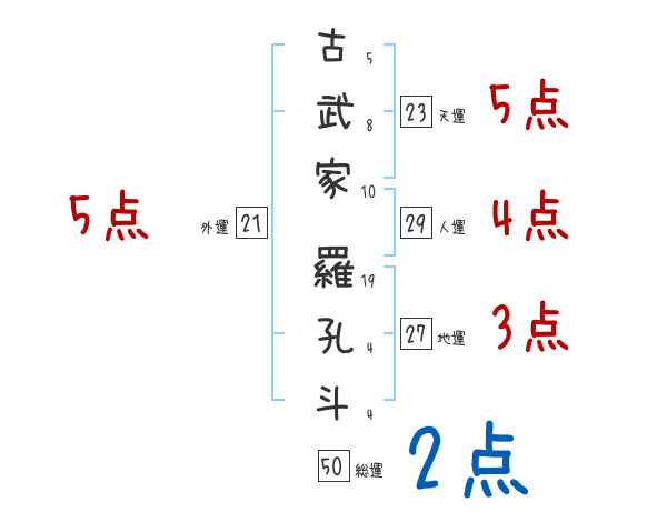 天運![]() | 古武家羅孔斗さんの天運は23画の5つ星!想像力に優れ活力がある。一代で成功し名誉を手に入れる。 家系が持つ宿命的な運勢を表します。祖先から受け継いだ苗字ですので自分の力が及びません。家柄を象徴します。 |
