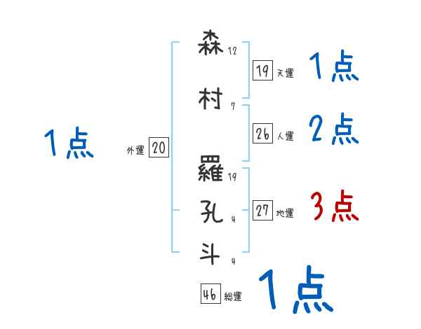 人運![]() | 森村羅孔斗さんの人運は26画の2つ星!波瀾万丈かも。信頼できる人を大事にしましょう。 性格や才能などを表す2番目に重要な運勢です。人間関係や協調性、社会的な成功に影響します。主に20歳から50歳ぐらいまでの中年期の運勢を表します。 |