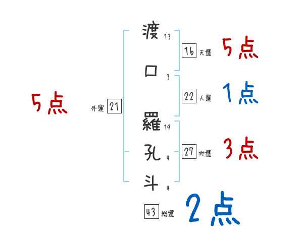 天運![]() | 渡口羅孔斗さんの天運は16画の5つ星!人望が厚く大きく発展する。逆転成功が見える。 家系が持つ宿命的な運勢を表します。祖先から受け継いだ苗字ですので自分の力が及びません。家柄を象徴します。 |