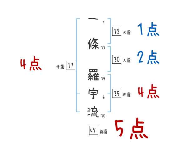 天運![]() | 一條羅宇流さんの天運は12画の1つ星!簡単な失敗で諦めてしまいやすいかも。着実に行動すると良いでしょう。 家系が持つ宿命的な運勢を表します。祖先から受け継いだ苗字ですので自分の力が及びません。家柄を象徴します。 |