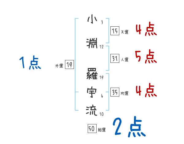 天運![]() | 小淵羅宇流さんの天運は15画の4つ星!人徳があり出世する。順調に物事を進め円満な人生。 家系が持つ宿命的な運勢を表します。祖先から受け継いだ苗字ですので自分の力が及びません。家柄を象徴します。 |