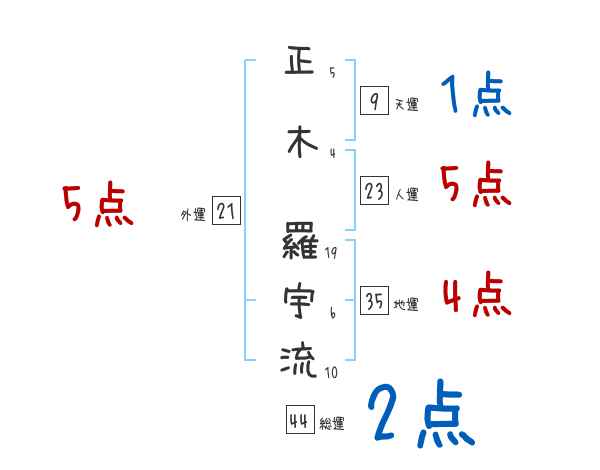 天運![]() | 正木羅宇流さんの天運は9画の1つ星!消極的で才能を発揮することが苦手なことも。周りの意見に耳を傾けましょう。 家系が持つ宿命的な運勢を表します。祖先から受け継いだ苗字ですので自分の力が及びません。家柄を象徴します。 |