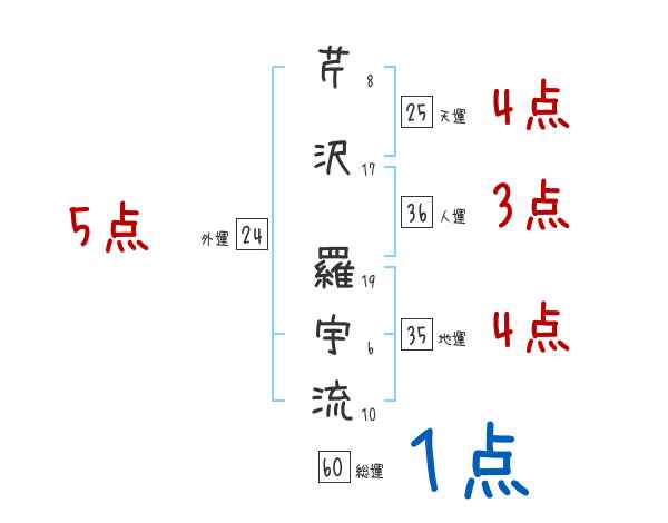 外運![]() | 芹沢羅宇流さんの外運は24画の5つ星!家庭運が良く順調な人生。金運にも恵まれる。 生活面を象徴する運勢です。外部から受ける影響力を表し、結婚運、家庭運や職場、環境への順応性を表します。 |