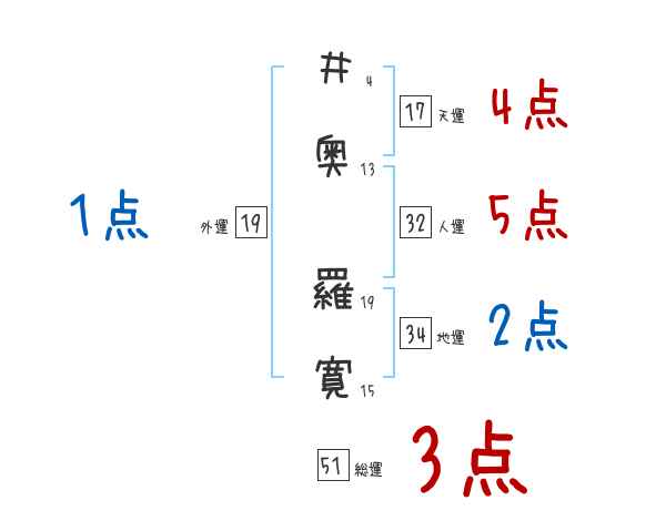 人運![]() | 井奥羅寛さんの人運は32画の5つ星!柔軟性があり成功する。チャンスが多く金運が良い。 性格や才能などを表す2番目に重要な運勢です。人間関係や協調性、社会的な成功に影響します。主に20歳から50歳ぐらいまでの中年期の運勢を表します。 |