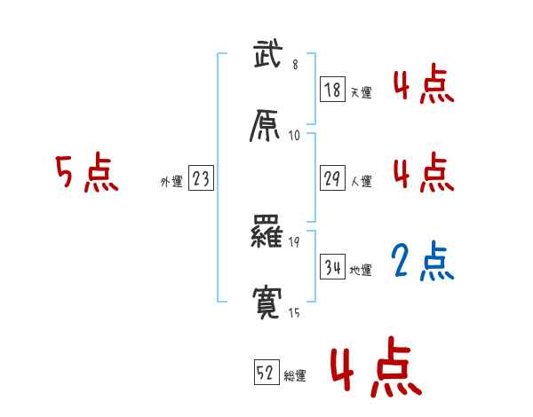 天運![]() | 武原羅寛さんの天運は18画の4つ星!情熱的で剛気。忍耐力があり信頼される。 家系が持つ宿命的な運勢を表します。祖先から受け継いだ苗字ですので自分の力が及びません。家柄を象徴します。 |