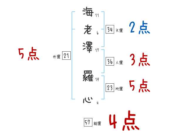 人運![]() | 海老澤羅心さんの人運は36画の3つ星!先見性が豊かです。多少神経質で苦労することも。 性格や才能などを表す2番目に重要な運勢です。人間関係や協調性、社会的な成功に影響します。主に20歳から50歳ぐらいまでの中年期の運勢を表します。 |