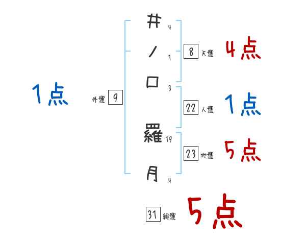 人運![]() | 井ノ口羅月さんの人運は22画の1つ星!努力することが苦手ないっぽう手先が器用。芸術性にも優れる。 性格や才能などを表す2番目に重要な運勢です。人間関係や協調性、社会的な成功に影響します。主に20歳から50歳ぐらいまでの中年期の運勢を表します。 |