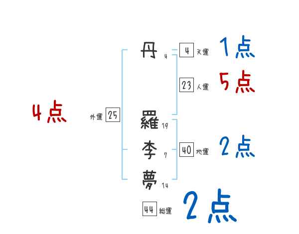 人運![]() | 丹羅李夢さんの人運は23画の5つ星!想像力に優れ活力がある。一代で成功し名誉を手に入れる。 性格や才能などを表す2番目に重要な運勢です。人間関係や協調性、社会的な成功に影響します。主に20歳から50歳ぐらいまでの中年期の運勢を表します。 |