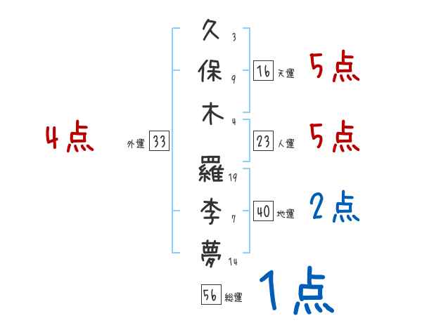 総運![]() | 久保木羅李夢さんの総運は56画の1つ星!消極的で無気力になりがち。誠実な気持ちが必要でしょう。 あなたの人生を表す1番重要な運勢です。生涯を通じて影響する総合運となり、主に50歳以降の晩年期に影響を及ぼします。 |
