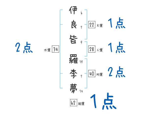 人運![]() | 伊良皆羅李夢さんの人運は28画の1つ星!家庭環境に注意。スポーツで活躍できる能力があるかも。 性格や才能などを表す2番目に重要な運勢です。人間関係や協調性、社会的な成功に影響します。主に20歳から50歳ぐらいまでの中年期の運勢を表します。 |