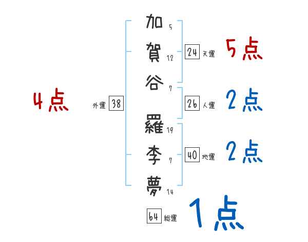外運![]() | 加賀谷羅李夢さんの外運は38画の4つ星!温厚な性格で技術的な才能を発揮する。職人的な仕事に向いている。 生活面を象徴する運勢です。外部から受ける影響力を表し、結婚運、家庭運や職場、環境への順応性を表します。 |