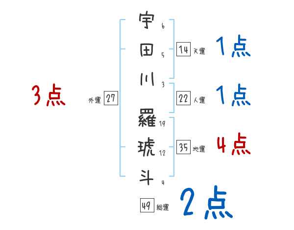 総運![]() | 宇田川羅琥斗さんの総運は49画の2つ星!不安定な性格で明暗がある人生。周りの人には支援されやすい。 あなたの人生を表す1番重要な運勢です。生涯を通じて影響する総合運となり、主に50歳以降の晩年期に影響を及ぼします。 |