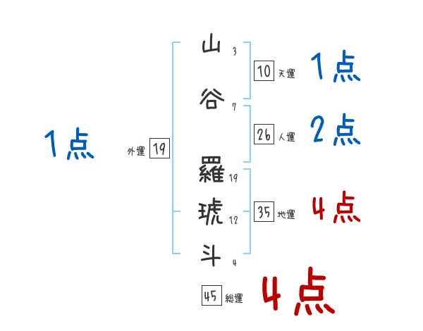 天運![]() | 山谷羅琥斗さんの天運は10画の1つ星!不安を感じやすい傾向。ストレスを抱えないように注意しましょう。 家系が持つ宿命的な運勢を表します。祖先から受け継いだ苗字ですので自分の力が及びません。家柄を象徴します。 |