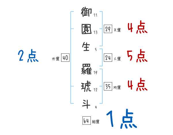 天運![]() | 御園生羅琥斗さんの天運は29画の4つ星!完全主義で才能がある。厳格な心の持ち主。 家系が持つ宿命的な運勢を表します。祖先から受け継いだ苗字ですので自分の力が及びません。家柄を象徴します。 |