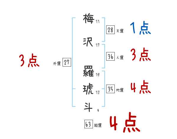 総運![]() | 梅沢羅琥斗さんの総運は63画の4つ星!家庭運がよく順調な生活。温和な性格。 あなたの人生を表す1番重要な運勢です。生涯を通じて影響する総合運となり、主に50歳以降の晩年期に影響を及ぼします。 |