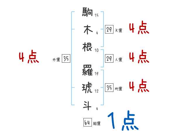 天運![]() | 駒木根羅琥斗さんの天運は29画の4つ星!完全主義で才能がある。厳格な心の持ち主。 家系が持つ宿命的な運勢を表します。祖先から受け継いだ苗字ですので自分の力が及びません。家柄を象徴します。 |