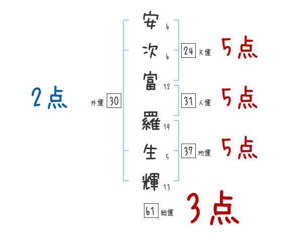 天運![]() | 安次富羅生輝さんの天運は24画の5つ星!家庭運が良く順調な人生。金運にも恵まれる。 家系が持つ宿命的な運勢を表します。祖先から受け継いだ苗字ですので自分の力が及びません。家柄を象徴します。 |